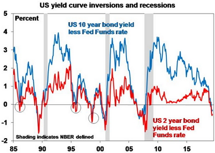 A common concern ever since the Global Financial Crisis (GFC) ended a decade ago is that the next recession is imminent. This concern has become more pronounced recently as yield curves – ie the gap between long-term bond yields and short-term borrowing rates – have inverted (or gone negative) as in the US. This concern has taken on added currency now that the US economic expansion is the longest on record. Surely it must be living on borrowed time?