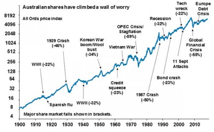 Related to this, shares literally climb a wall of worry over many years with numerous events dragging them down periodically, but with the long-term trend ultimately rising and providing higher returns than other more stable assets. In fact, bouts of volatility are the price we pay for the higher longer-term returns from shares.