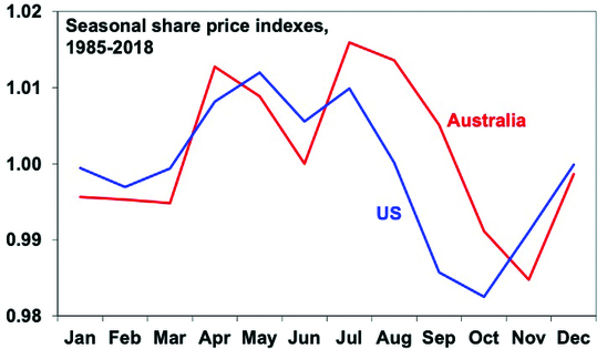 Our view is that share markets will head higher this year as recovery continues and this boosts earnings. However, investor sentiment is very bullish which is negative from a contrarian perspective and we are coming into a seasonally softer period of the year for shares, as the old saying “sell in May and go away..” reminds us and the next chart illustrates (although Australian shares can push higher into July). Geopolitical risks as noted above – along with a resumption of the bond market tantrum as inflation rises further and maybe a new coronavirus scare – could provide a trigger for a short-term correction.