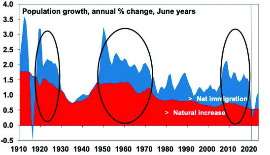 The second long-term boom got underway after WW2 and ran into the early 1970s supported by very strong economic and population growth (see the second circled area in the population chart). This saw real property prices rise from 50% below their long-term trend to be 50% above trend by 1973.