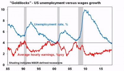 First, although US inflation has moved up it remains relatively benign with the core private final consumption deflator around 2% year on year which is the Fed’s inflation target. It seems every US jobs report has seen the same “Goldilocks” (not too hot/not too cold) combination of strong jobs growth and falling (now sub-4%) unemployment but low wages growth of around 2.7-2.8% year on year implying low inflation pressures. See the next chart.