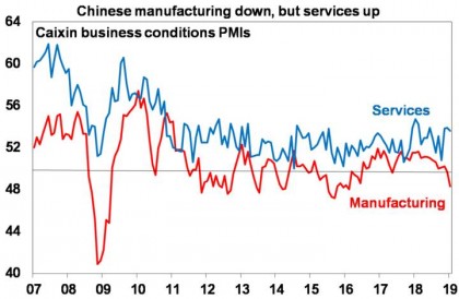 Second, while manufacturing has slowed, services has continued to hold up well. This is evident in relatively solid readings for the services conditions PMIs (in both the official and Caixin PMIs) of around 54 in contrast to weaker manufacturing PMIs – see the second chart above. Services are less affected by trade wars and the services sector is expanding relative to the manufacturing sector. Out of interest this may partly explain why GDP growth in China is now smoother and does better than expected with most commentators focusing on the old manufacturing sector.
