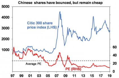 Chinese shares have bounced 9% from their December low. But they had a 32% top to bottom fall last year and are still cheap trading on a price to forward earnings ratio of just 10 times (compared to 14.7 times for Australian shares) which is about as cheap as they ever get. See the next chart.