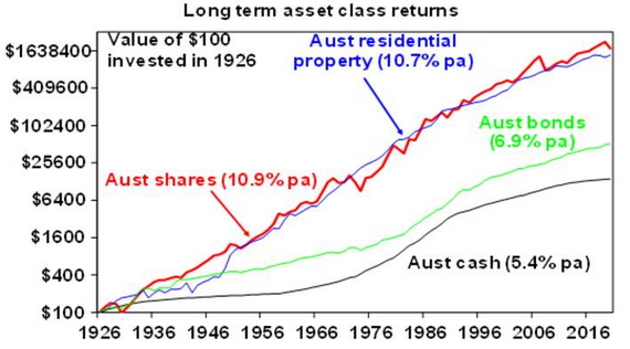 Superannuation is aimed (within reason) at providing maximum (risk-adjusted) funds for use in retirement. So typical Australian super funds have a bias towards shares and other growth assets that grow in value with the economy, particularly for younger members, and some exposure to defensive assets like bonds and cash to avoid excessive short-term volatility. These approaches aim to make the most of the power of compound interest which sees returns build on returns over time. The next chart shows the value of a $100 investment in Australian cash, bonds, shares and residential property from 1926 assuming any interest, dividends and rents is reinvested along the way.