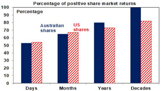 But while the above chart covered more than 90 years of returns, our natural tendency is to think very short term. Particularly so in times of uncertainty like now. And this is where the problem starts. On a day to day basis shares are down almost as much as they are up. See the next chart. So, day to day, it’s pretty much a coin toss as to whether you will get good news or bad on shares. But if you just look monthly and allow for dividends, the historical experience suggests you will only get bad news around a third of the time. If you go out to once a decade, positive returns have been seen 100% of the time for Australian shares and 82% for US shares. So while it’s hard given the bombardment of financial news these days it makes sense to look at your returns less because then you are more likely to get positive returns and less likely to make rash decisions based on short term bad news.