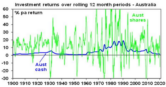 This can also be demonstrated in the following charts. On a rolling 12 month ended basis the returns from shares bounce around all over the place compared to the relative stability of cash (and bonds). See the next chart.