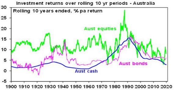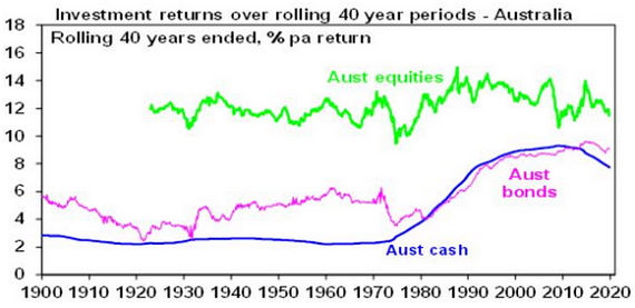 Pushing the horizon out to rolling 20-year returns has almost always seen shares do even better, although a surge in cash and bond returns from the 1970s/1980s has seen the gap narrow. Over rolling 40-year periods – the working years of a typical person – shares have always done better.