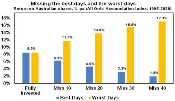 The temptation to do this is immense. With the benefit of hindsight many swings in markets like the tech boom and bust, the GFC and maybe in the years ahead the current episode look inevitable and hence forecastable and so it’s natural to think “why not give it a go?” by switching between say cash and shares within your super to anticipate market moves. Fair enough if you have a process and put the effort in. But without a tried and tested market timing process, trying to time the market is difficult. A good way to demonstrate this is with a comparison of returns if an investor is fully invested in shares versus missing out on the best (or worst) days. The next chart shows that if you were fully invested in Australian shares from January 1995, you would have returned 8.5% pa (with dividends but not allowing for franking credits, tax and fees).