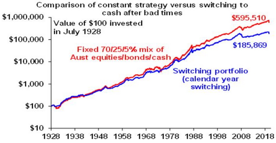 Over the long run the switching portfolio produces an average return of 8.6% pa versus 9.9% pa for the balanced mix. From a $100 investment in 1928 the switching portfolio would have grown to $185,869 compared to $595,510 for the constant mix.