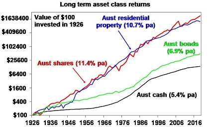 Because shares and property provide higher returns over long periods the value of an investment in them compounds to a much higher amount over long periods. So, it makes sense to have a decent exposure to them when saving for retirement. The higher return from shares and growth assets reflects compensation for the greater risk in investing in them – in terms of capital loss, volatility and illiquidity – relative to cash & bonds.