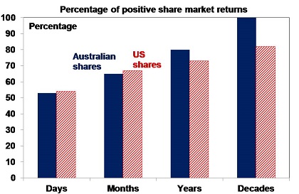 Of course, we don’t have ninety odd years to save for retirement. In fact, our natural tendency is to think very short term. And this is where the problem starts. On a day to day basis shares are down almost as much as they are up. See the next chart. So, day to day, it’s pretty much a coin toss as to whether you will get good news or bad. So, it’s understandable that many are skeptical of them. But if you just look monthly and allow for dividends, the historical experience tells us you will only get bad news around a third of the time. If you go out to once a decade, positive returns have been seen 100% of the time for Australian shares and 82% for US shares.