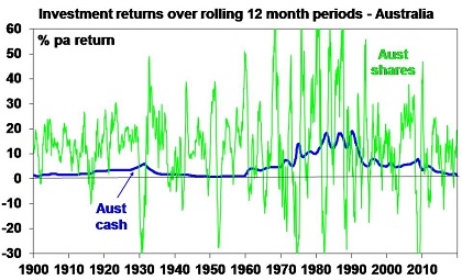 This can also be demonstrated in the following charts. On a rolling 12 month ended basis the returns from shares bounce around all over the place relative to cash and bonds.