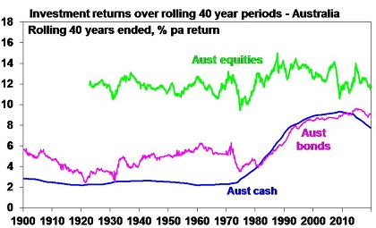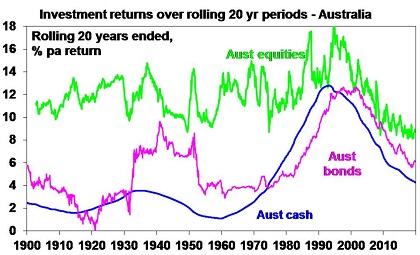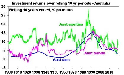 Pushing the horizon out to rolling 20-year returns has almost always seen shares do even better, although a surge in cash and bond returns from the 1970s/1980s (after high inflation pushed interest rates up) has seen the gap narrow.