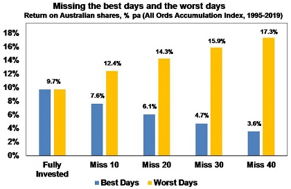 The temptation to do this is immense. With the benefit of hindsight many swings in markets like the tech boom and bust and the GFC look inevitable and hence forecastable and so it’s natural to think “why not give it a go?” by switching between say cash and shares within your super to anticipate market moves. Fair enough if you have a process and put the effort in. But without a tried and tested market timing process, trying to time the market is difficult. A good way to demonstrate this is with a comparison of returns if an investor is fully invested in shares versus missing out on the best (or worst) days. The next chart shows that if you were fully invested in Australian shares from January 1995, you would have returned 9.7% pa (with dividends but not allowing for franking credits, tax and fees).