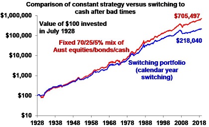 Over the long run the switching portfolio produces an average return of 8.8% pa versus 10.2% pa for the balanced mix. From a $100 investment in 1928 the switching portfolio would have grown to $218,040 compared to $705,497 for the constant mix.